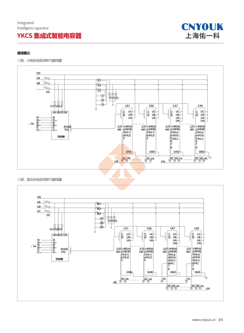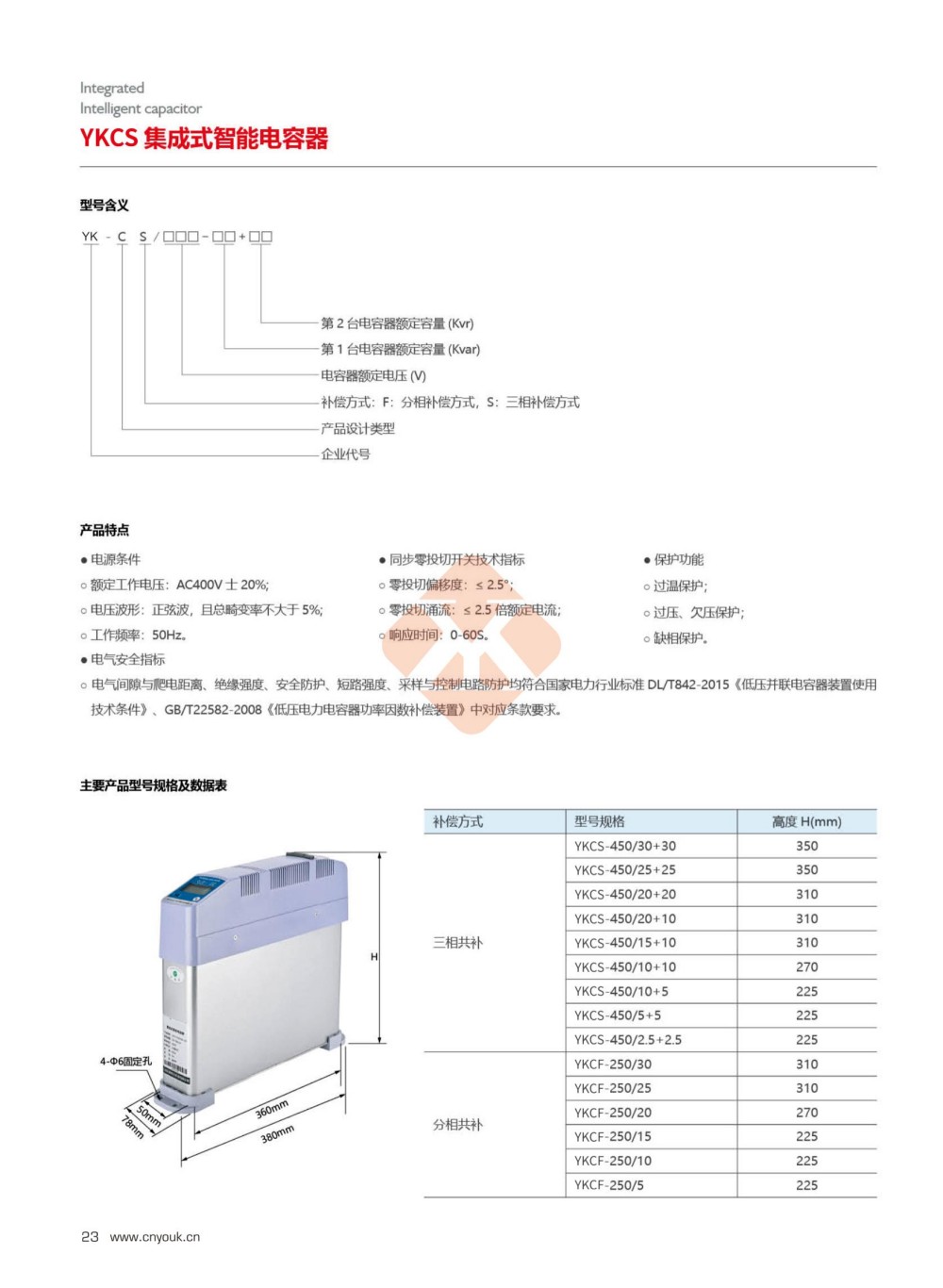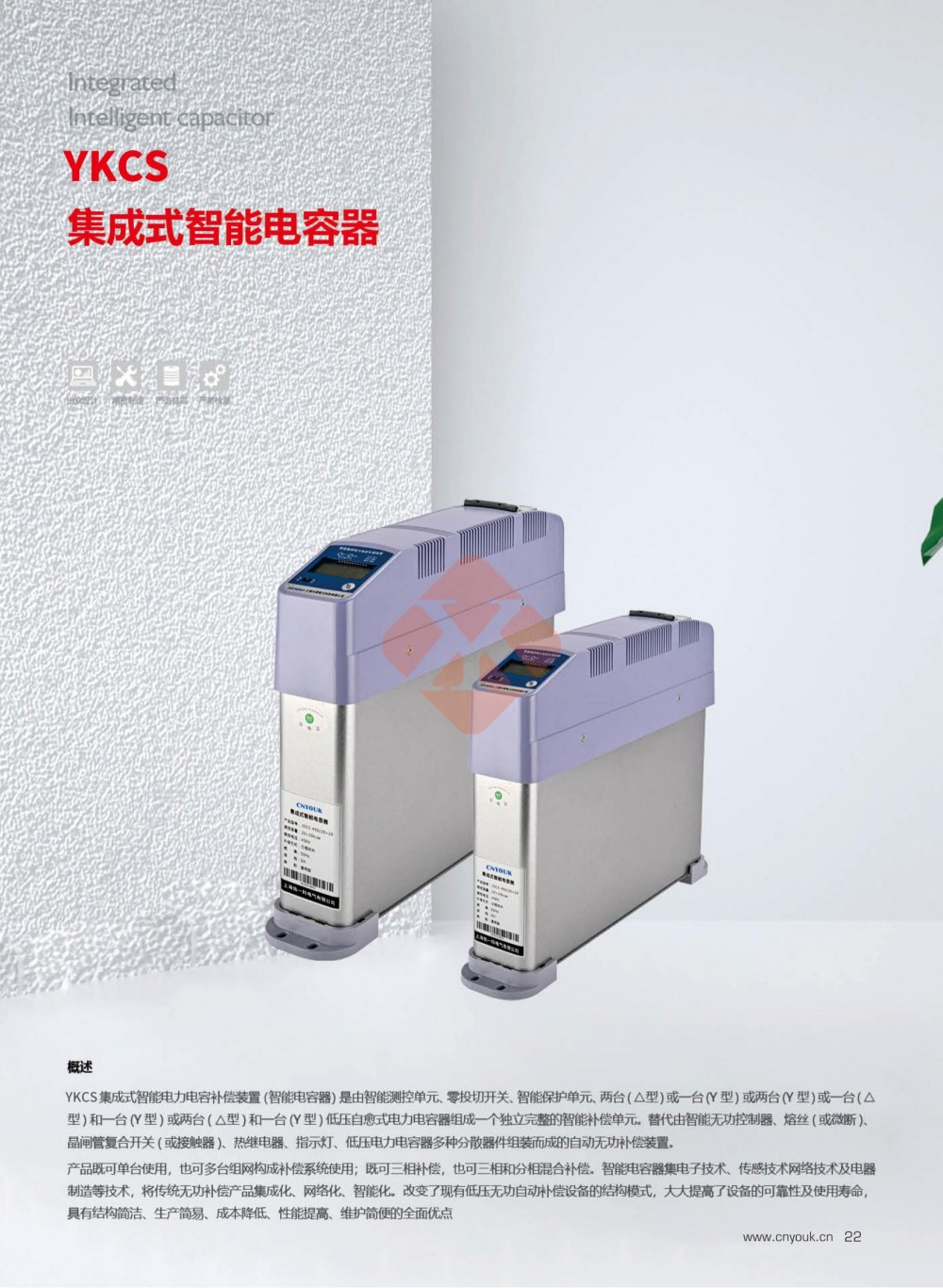 YKC(F)S集成式智能电容器是0.4KV低压配电网有效节能、降低线损、提高功率因数和电能质量的无功补偿设备,它由智能测控单元,晶闸管复合开关电路,线路保护单元两合(△型)或一台(Y型)低压电力电容器、指示灯等散件在柜内和柜面由导线连接而组成的自动无功补偿装置。改变了传统无功补偿装置体积庞大和笨重的结构模式。从而使低压无功补偿设备具有补偿效果较好,体积较小,功耗较低,价格较廉,节约成本较多,使用较加灵活,维护较加方便,使用寿命较长,可靠性较高的特点,适应了现代电网对无功补偿的较高要求。